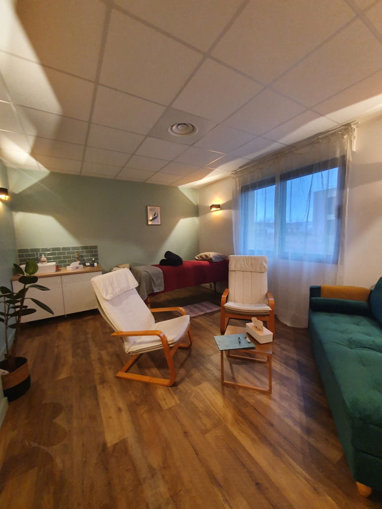 Au cabinet, vous serez installé sur une table de massage, le plus confortablement possible, avec oreillers et couverture, afin de créer une atmosphère relaxante et accueillante, tel un cocon réconfortant.